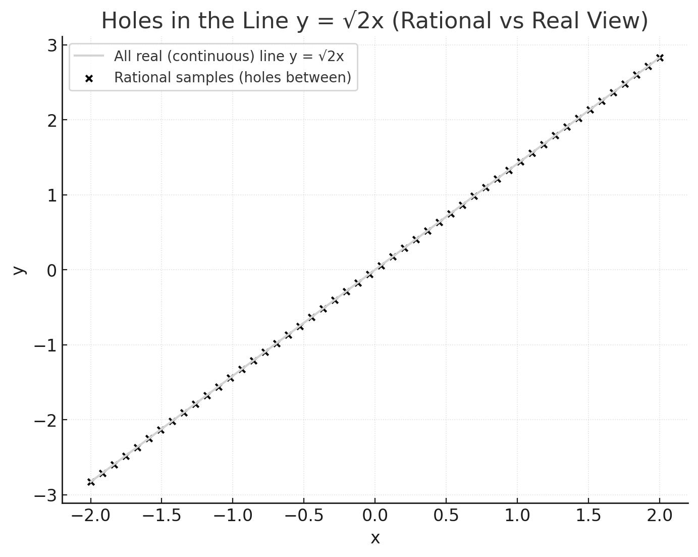 We can define ½ or ¾ easily, but we cannot define √2 — its decimal expansion never ends. If we think about discrete mathematics, which is the foundation of the digital computer, the number line is disrupted by these numbers that never end, we cannot smoothly move from an irrational number to the number immediately after or before it.